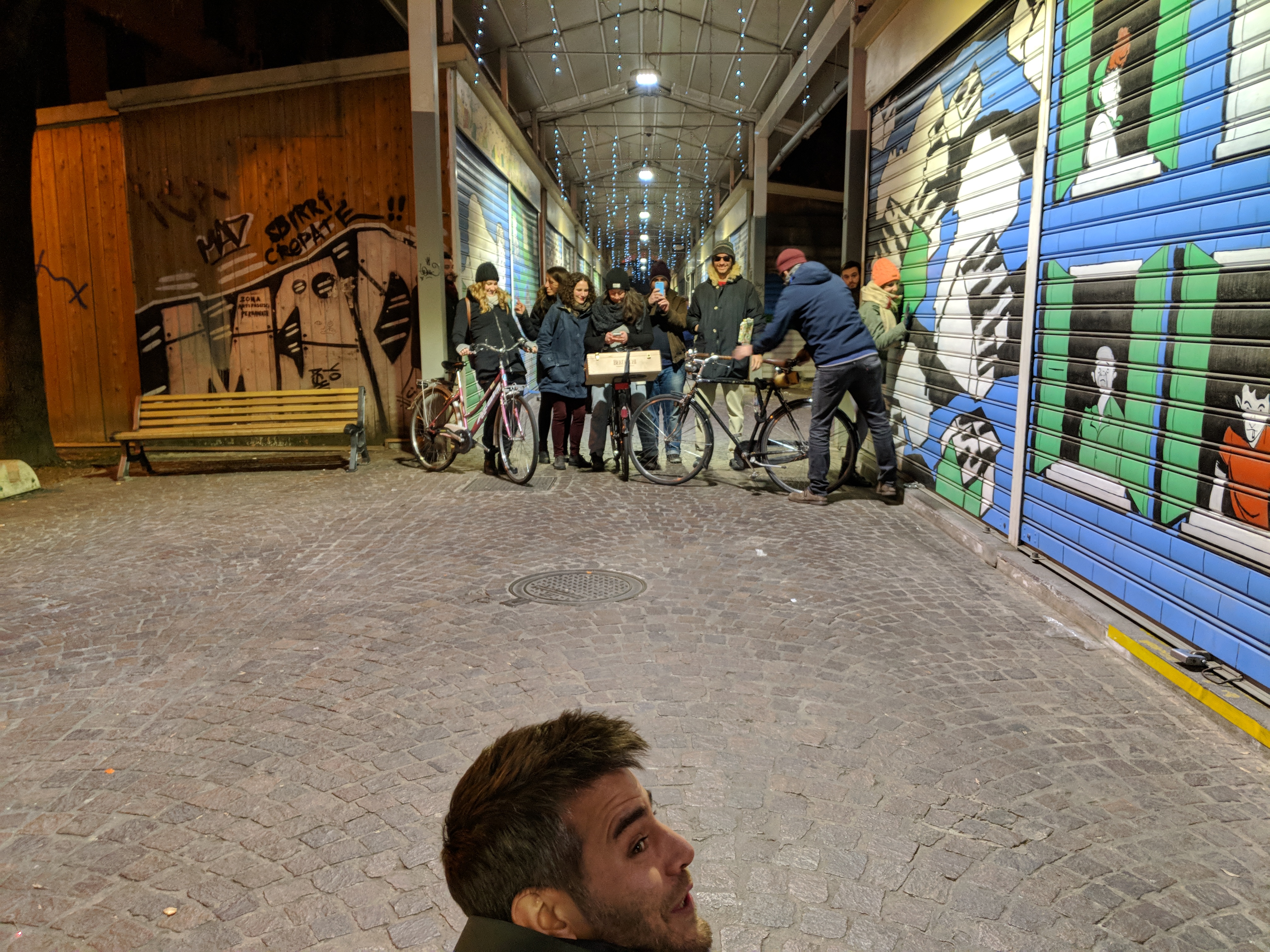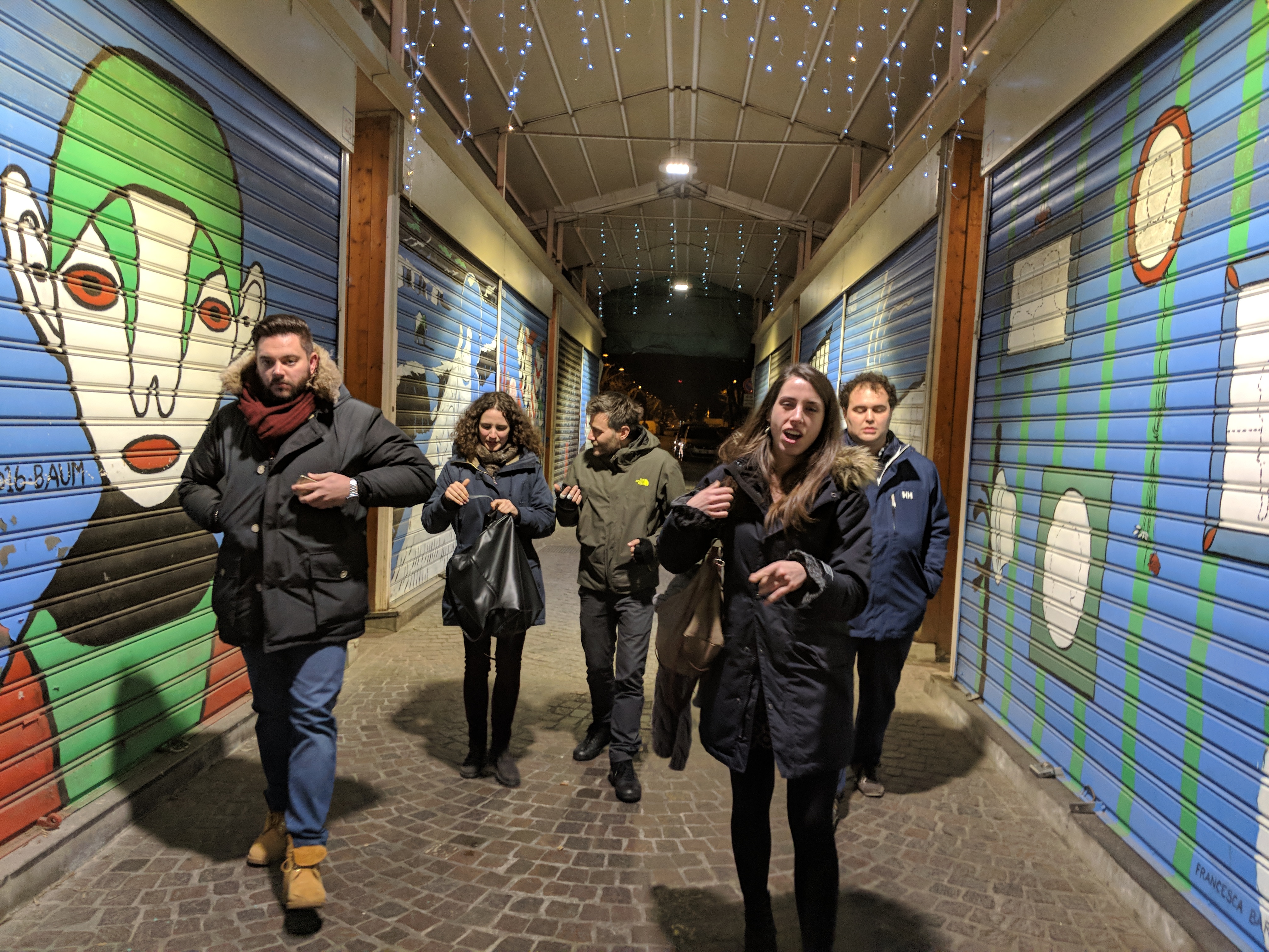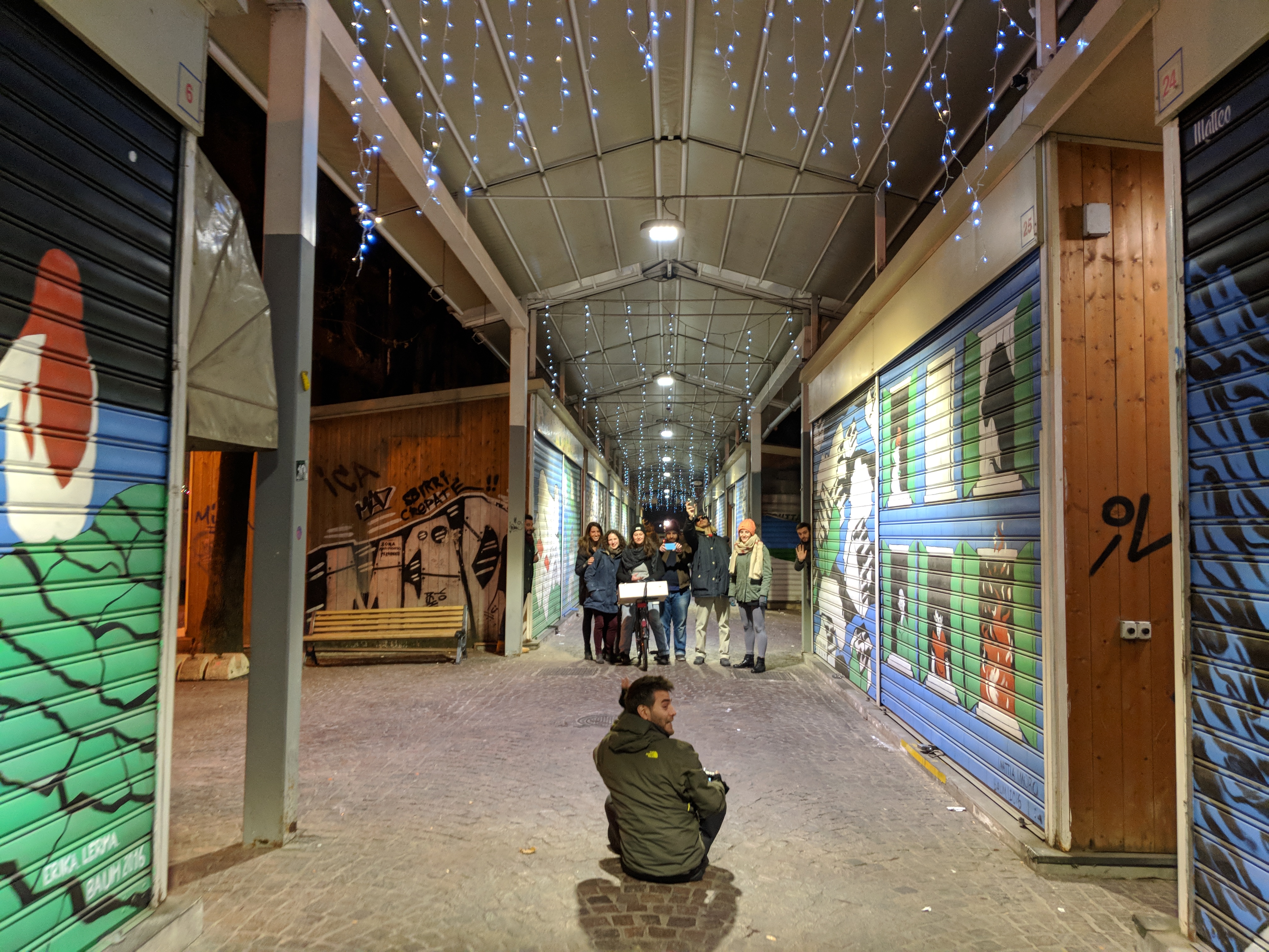 In più c’è il mercato, dove potremmo fare rifornimento di mandarini e panini con la mortazza.